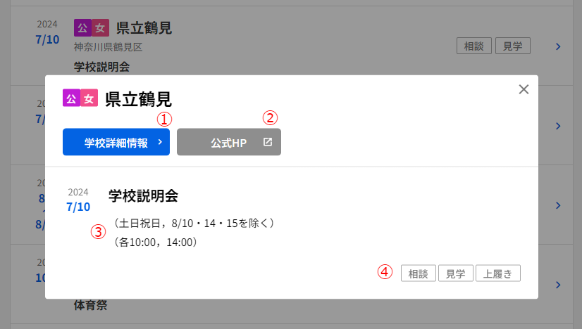 - ②高校の公式HPにアクセスします。こちらからイベント日程の確認や予約をしましょう。