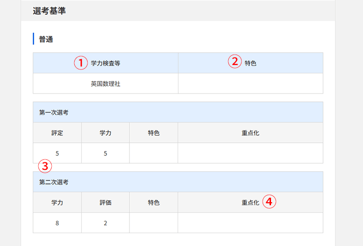 実施しない学校は「ブランク」になっています。 - ④各選考における重点化の内容を記載しています。