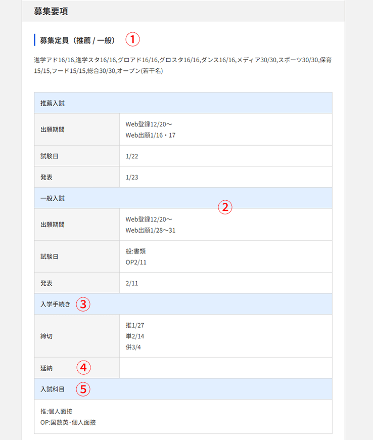 - ①募集コースと定員を記載しています。コース名の後ろに定員数を「推薦/一般」の順で記載しています。